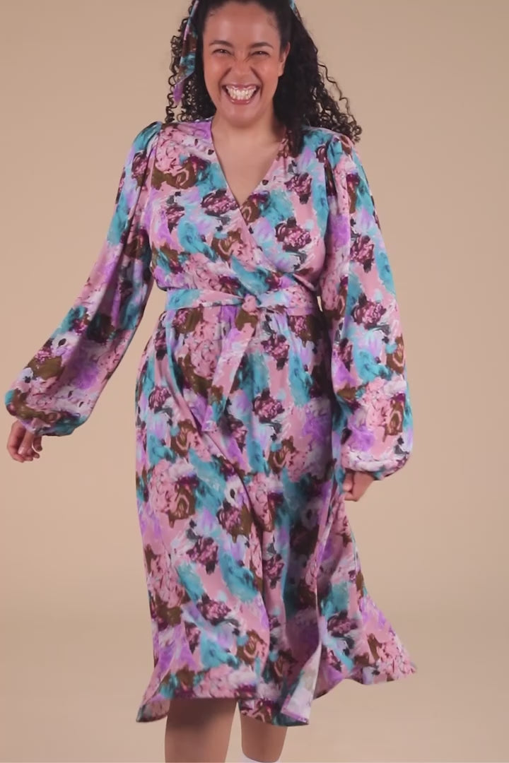 Ein wandlungsfähiges und auffälliges Kleid, das sich sowohl für den Alltag als auch für festliche Anlässe eignet. Der schmeichelhafte Wickelschnitt und der verstellbare Bund sorgen für eine perfekte Passform für jede Körperform. Die weiten, langen Ärmel sind mit gerafften Gummibündchen versehen und die Schulterfalten sorgen für ein schönes Volumen in den Ärmeln. Der Saum des Kleides reicht bis zur Wadenhöhe.