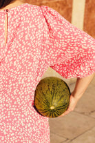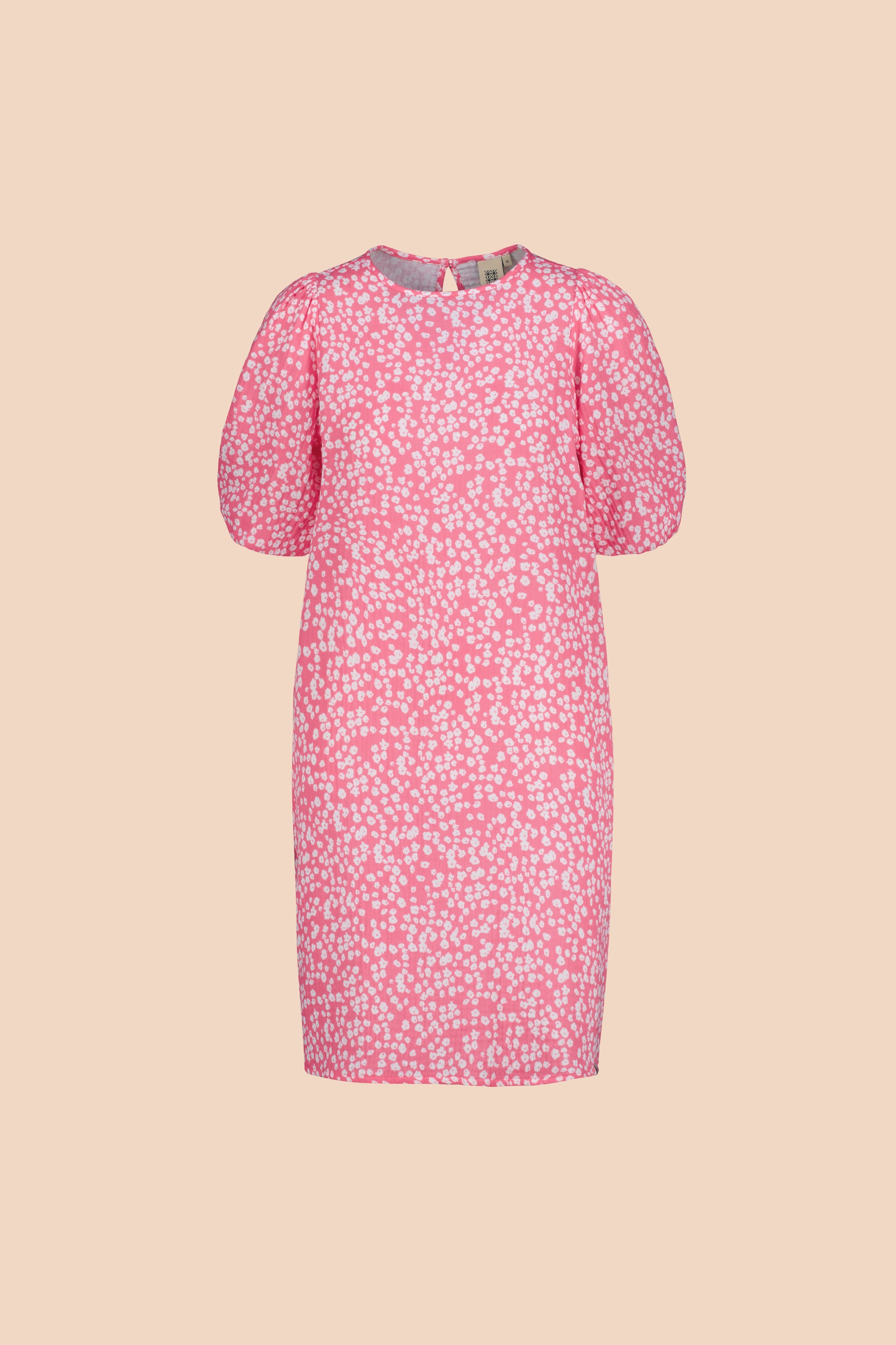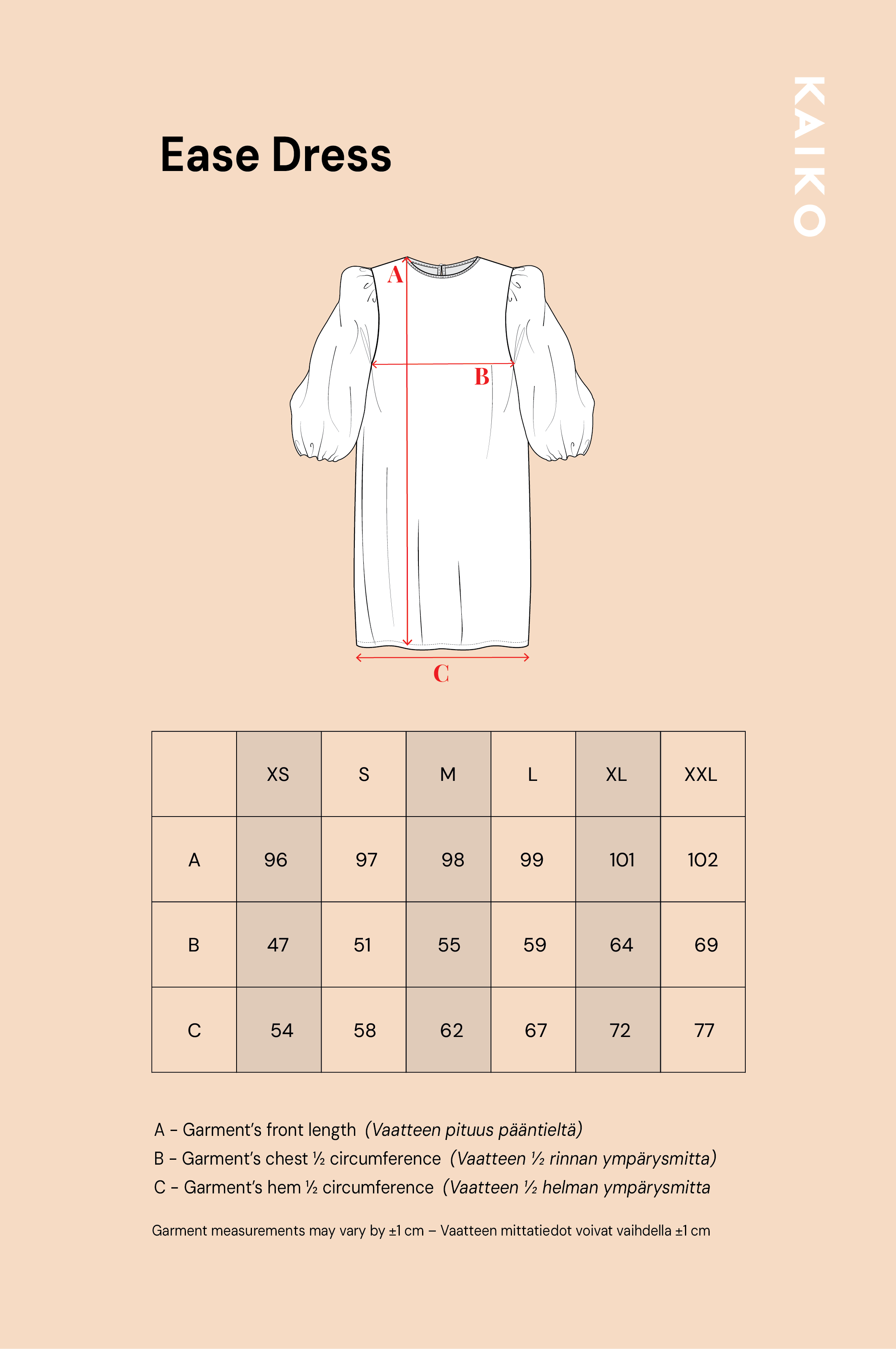 Ease Dress -mekossa on väljä, suora siluetti ja sivusaumoissa on taskut. Kyynärvarsimittaisissa hihoissa on olalla poimutusta, joka luo hihoihin kaunista volyymia, ja hihansuut on poimutettu kuminauhalla. Niskassa on pieni halkio ja nappikiinnitys. Kuosina Flora Pink.