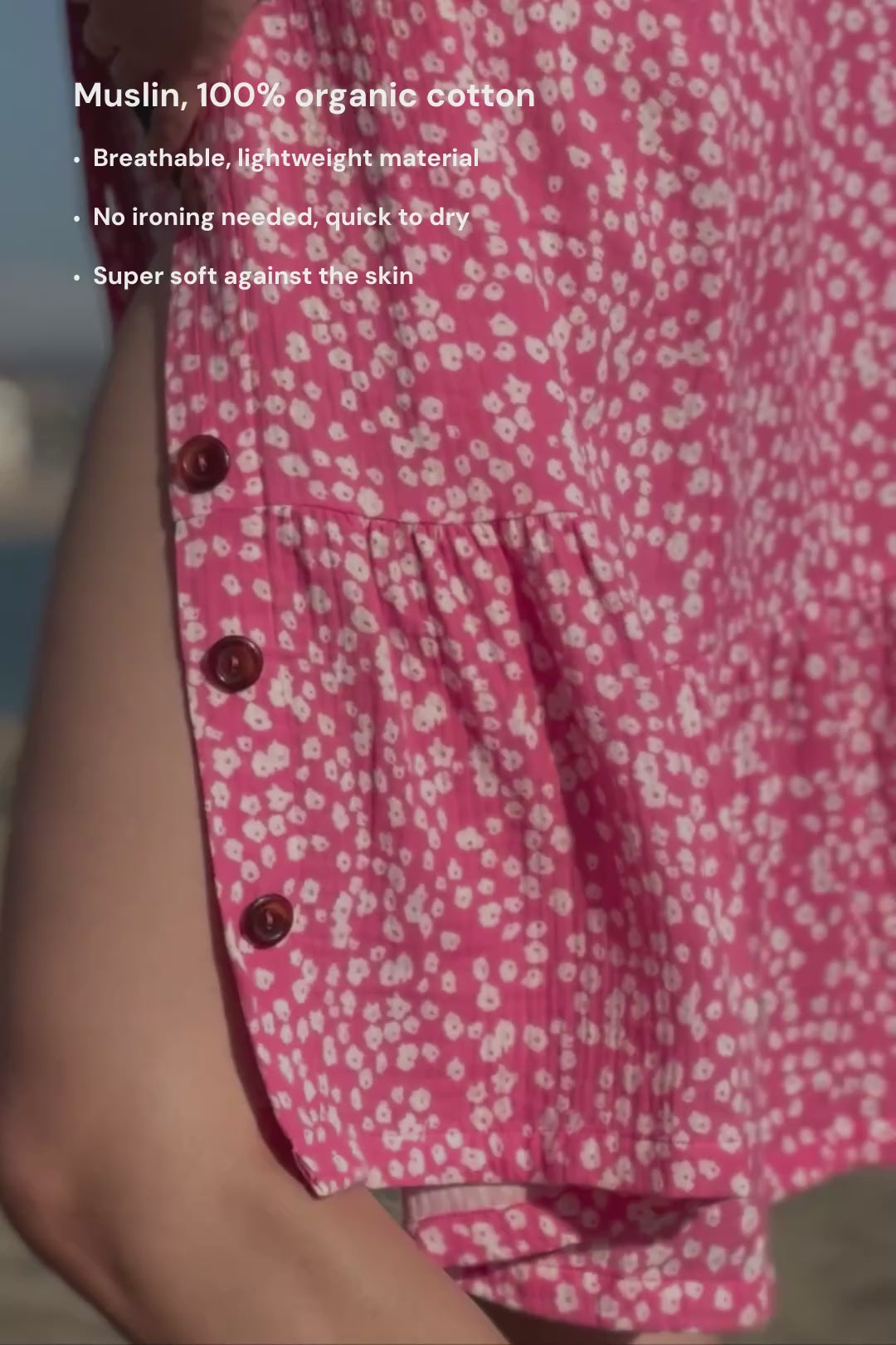 Ease Dress on valmistettu pehmeästä ja helppohoitoisesta luomupuuvillamusliinista. Kankaassa on kaunis, eläväpintainen tekstuuri, eikä materiaali kaipaa lainkaan silitystä.