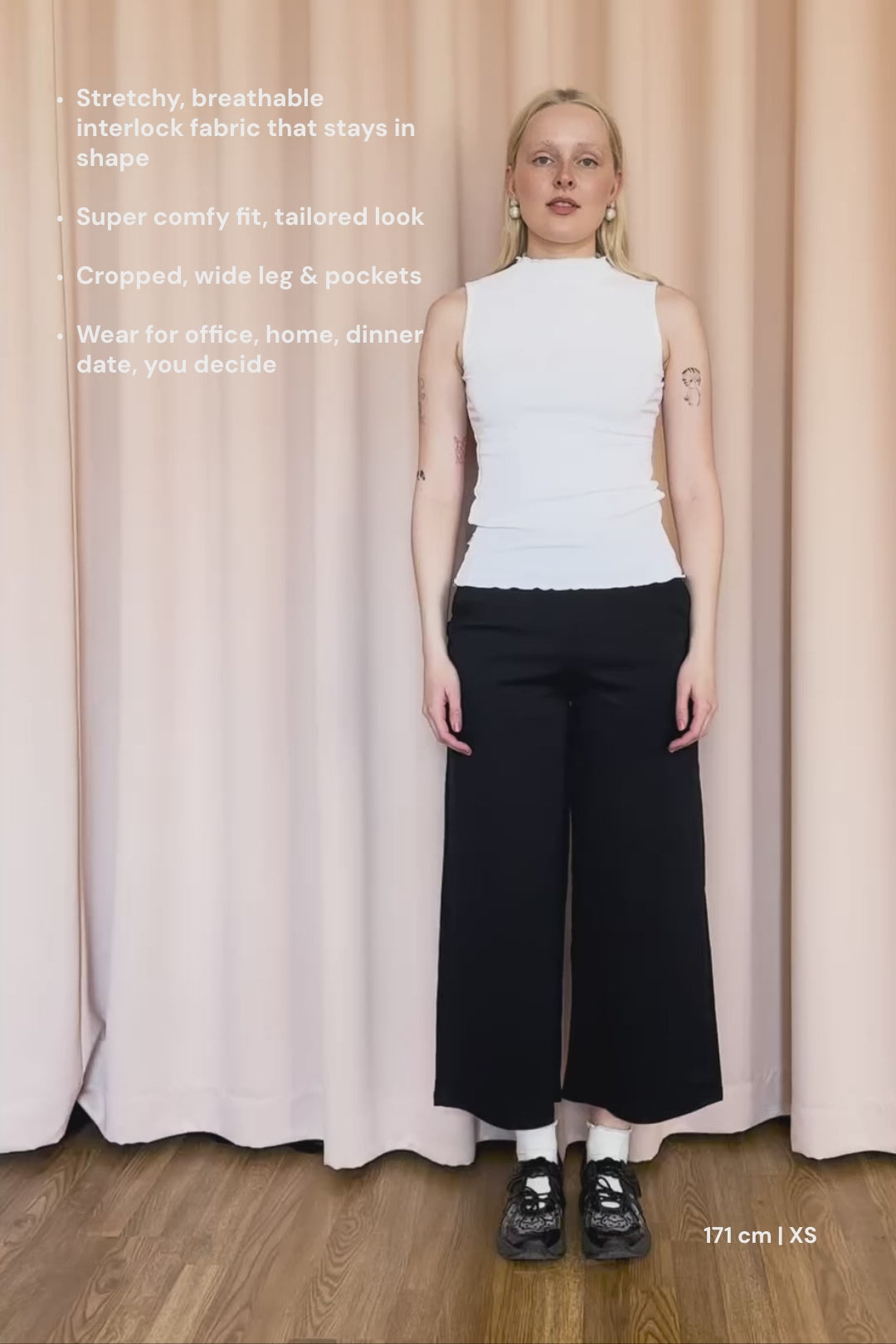 Kun haluat siistit housut, jotka eivät tingi mukavuudesta ovat Everyday Culottes -housut varma valinta. Napakasta ja joustavasta ponte roma -interlock-neuloksesta valmistetut housut näyttävät skarpeilta, mutta tuntuvat päällä ihanan pehmeiltä. Housuissa on leveä joustava vyötärö (5 cm korkea) ja edessä taskut. Sivusaumoissa kulkee denim-tikkaus, joka luo housuihin ekstraskarppia fiilistä. Värinä klassinen musta.