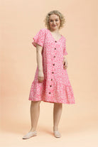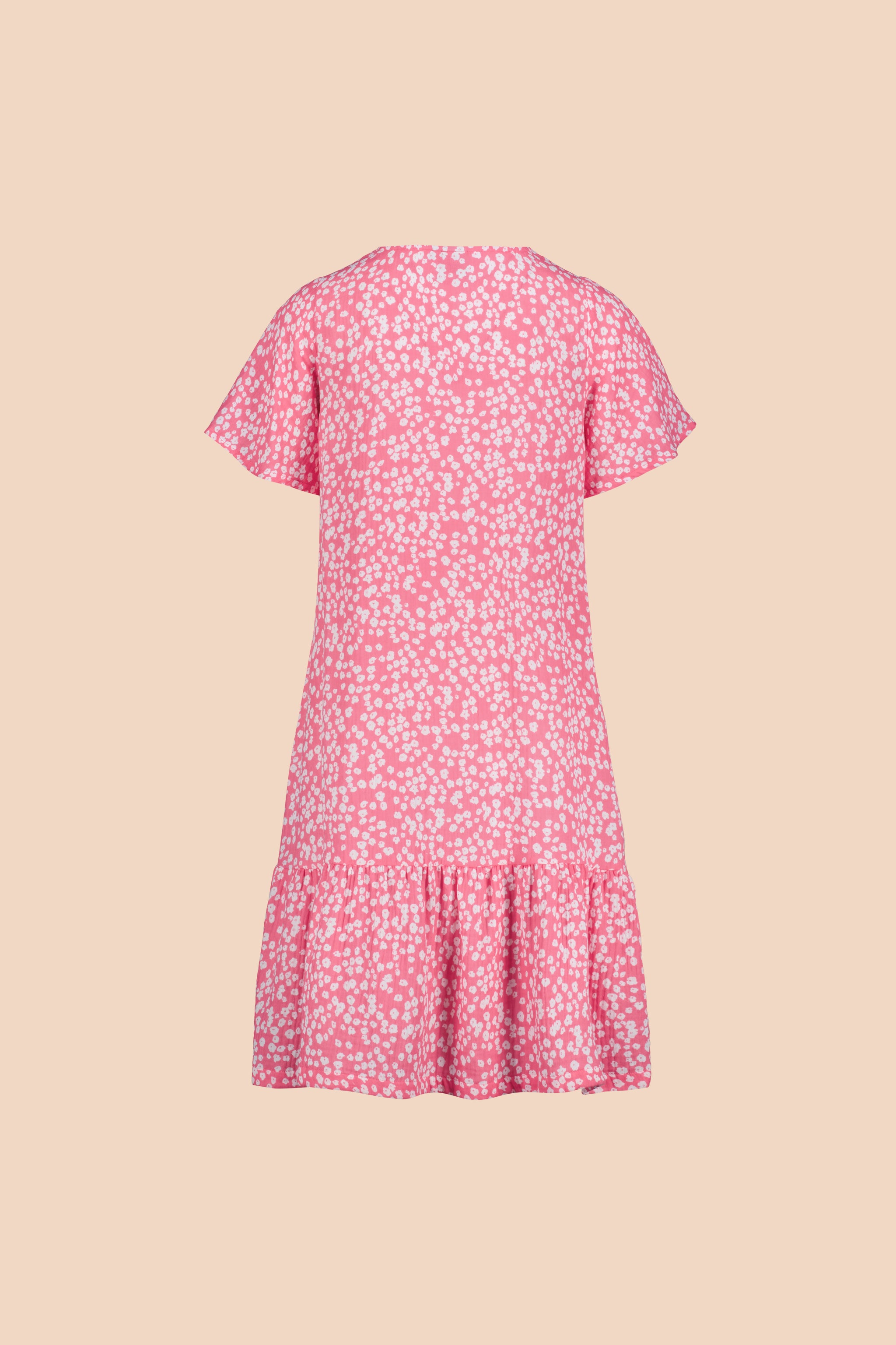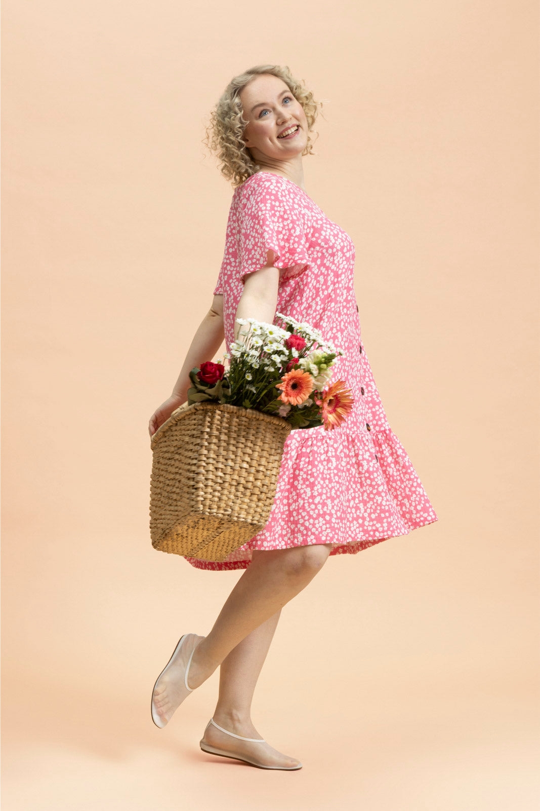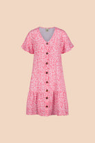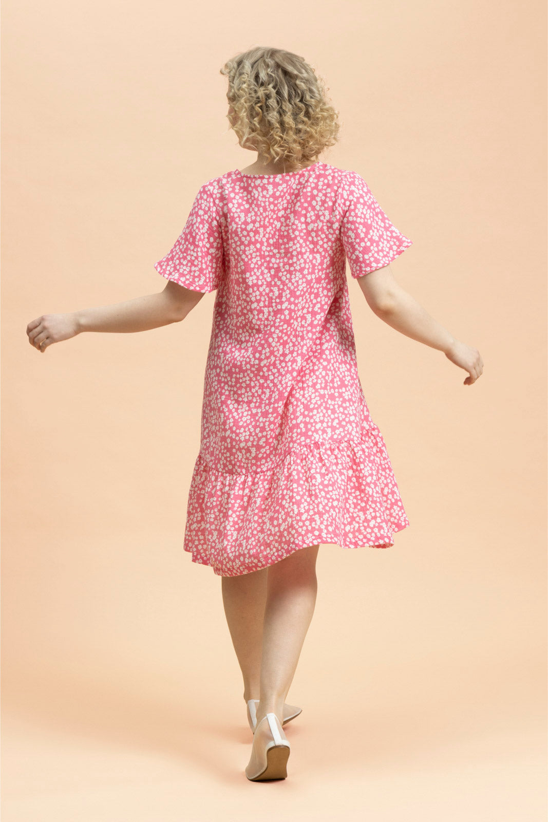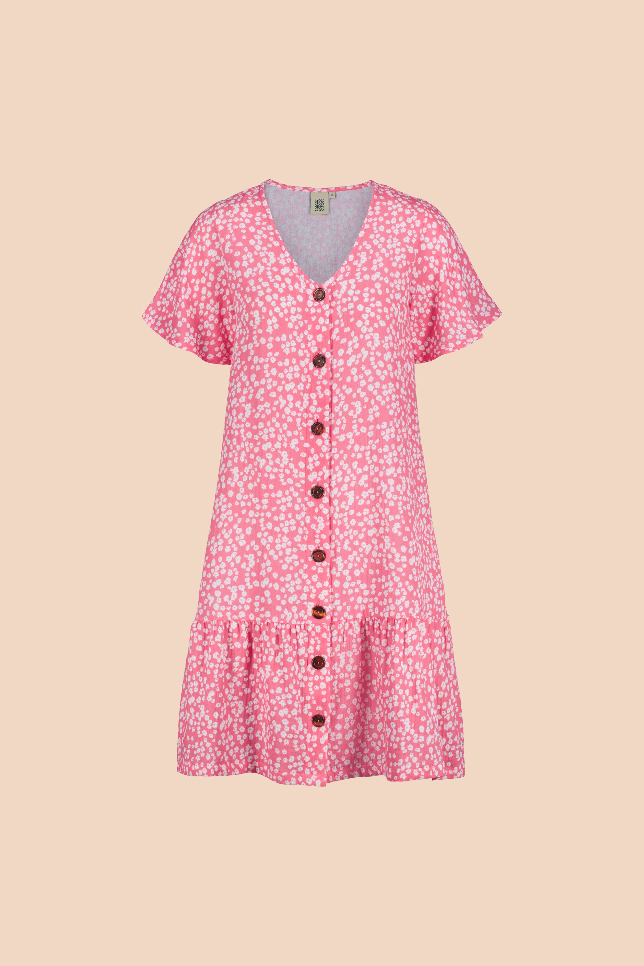 Vastuullisesti valmistetussa mekossa on väljä istuvuus, v-pääntie, kevyesti kellotetut hihat ja keskellä edessä kulkee nappirivi. Helmaa koristaa poimutettu frilla. Frillan korkeus 25 cm. Helman pituus noin polvimittainen. Kuosina Flora Pink.