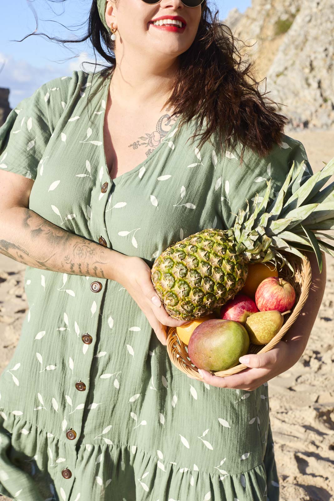Vastuullisesti valmistetussa mekossa on väljä istuvuus, v-pääntie, kevyesti kellotetut hihat ja keskellä edessä kulkee nappirivi. Helmaa koristaa poimutettu frilla. Frillan korkeus 25 cm. Helman pituus noin polvimittainen. Kuosina Sage Wind, jonka murretun vihreää pohjaa koristavat minimalistiset lehtikuviot.
