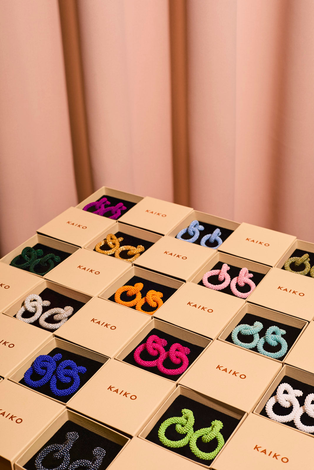 Kaikon Gia-korvakorut on valmistettu käsityönä Nepalissa, ja ne on on koottu pienistä lasihelmistä. Korun pituus on noin 6 cm ja suuremman lenkin halkaisija on noin 3,5 cm. Korvakorujen kiinnikkeet ovat messinkiä ja nikkelivapaat, mutta voivat ärsyttää erittäin herkkää ihoa.