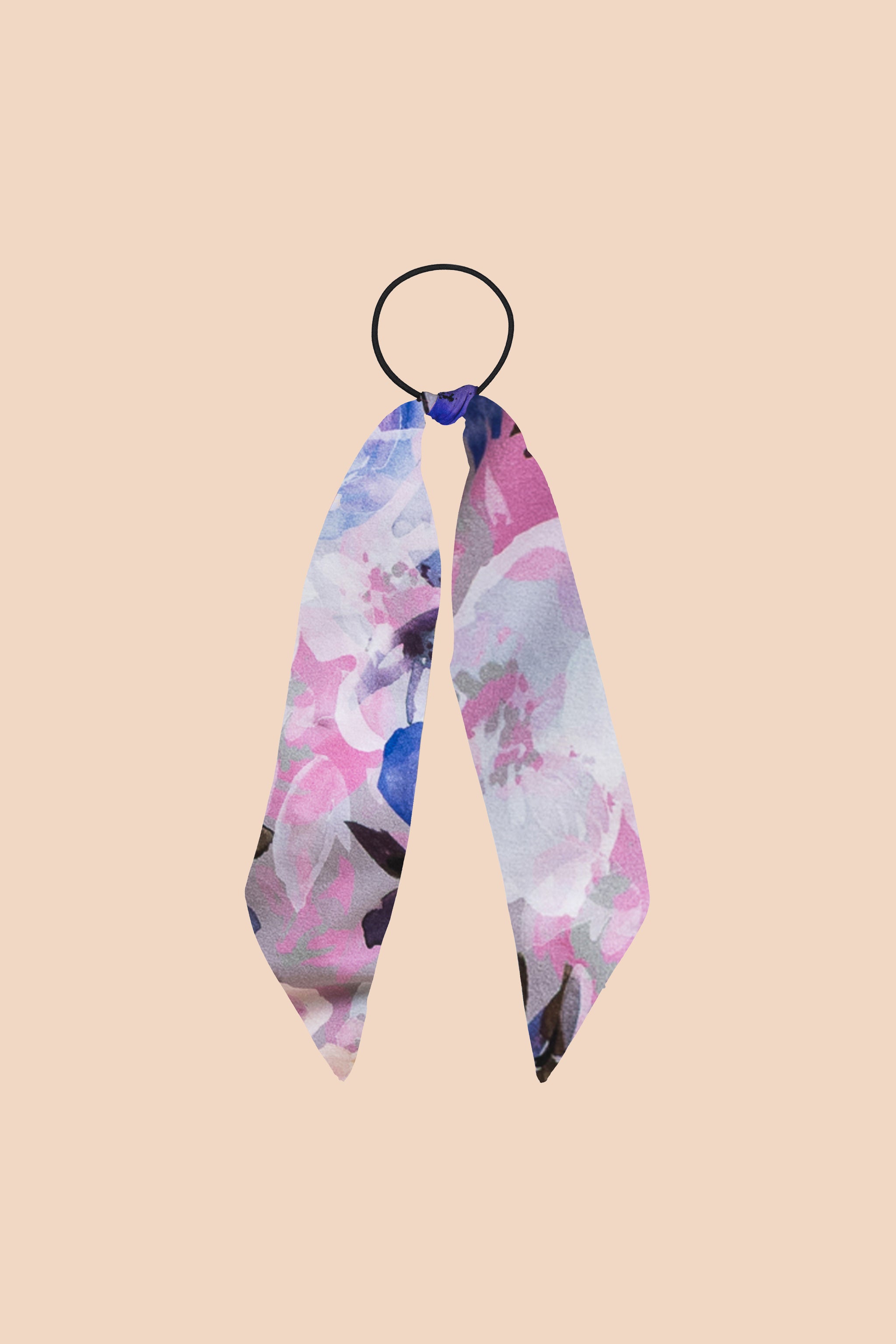 Ponytail Scarf -huiviponnarin kuosina Lilac Anemone. Kumiseen mustaan hiuslenkkiin on sidottu minihuivi, jonka saa halutessaan irrotettua vaikkapa muihin kampaustarkoituksiin.