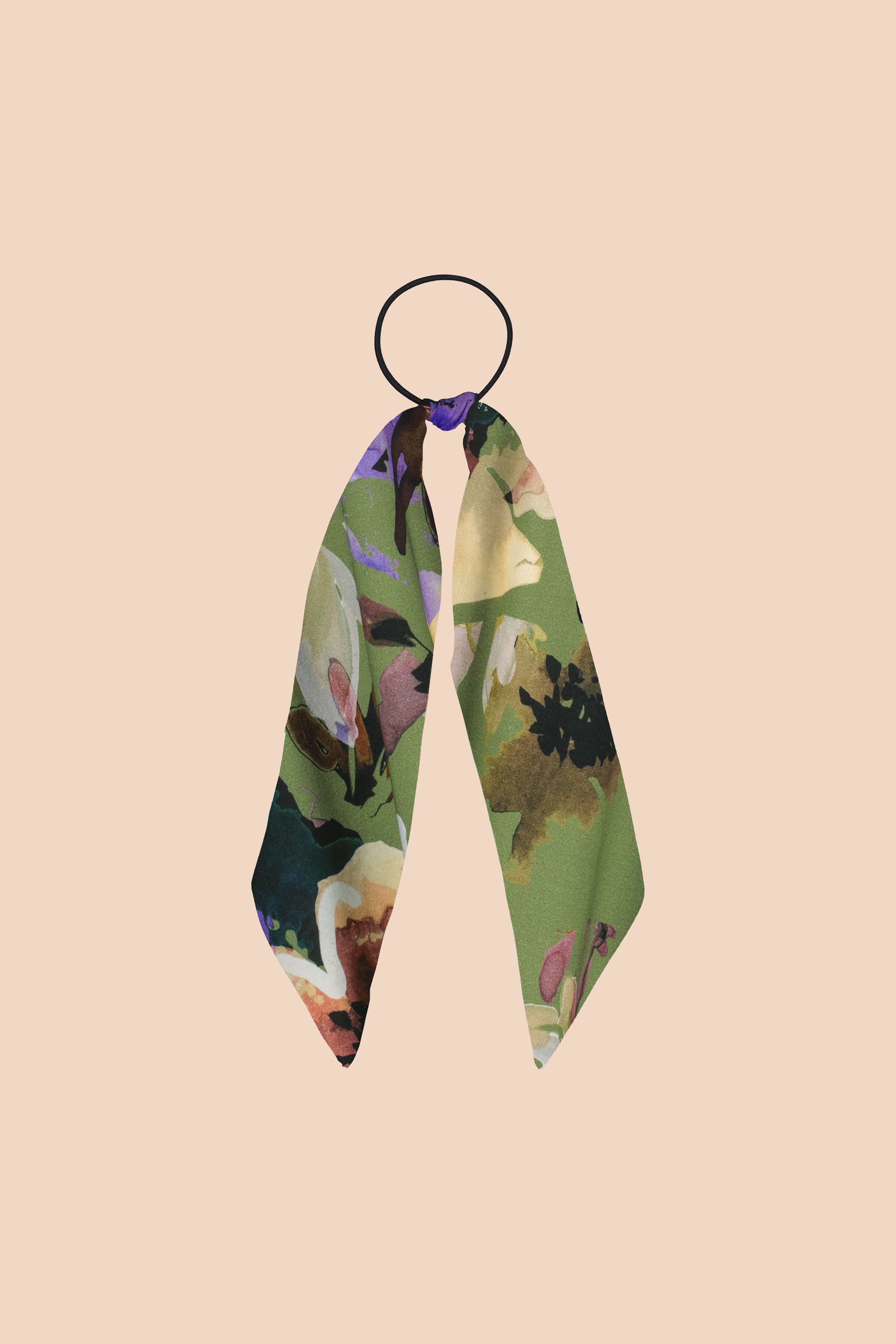 Ponytail Scarf -huiviponnarin kuosina Olive Anemone. Kumiseen mustaan hiuslenkkiin on sidottu minihuivi, jonka saa halutessaan irrotettua vaikkapa muihin kampaustarkoituksiin.