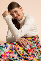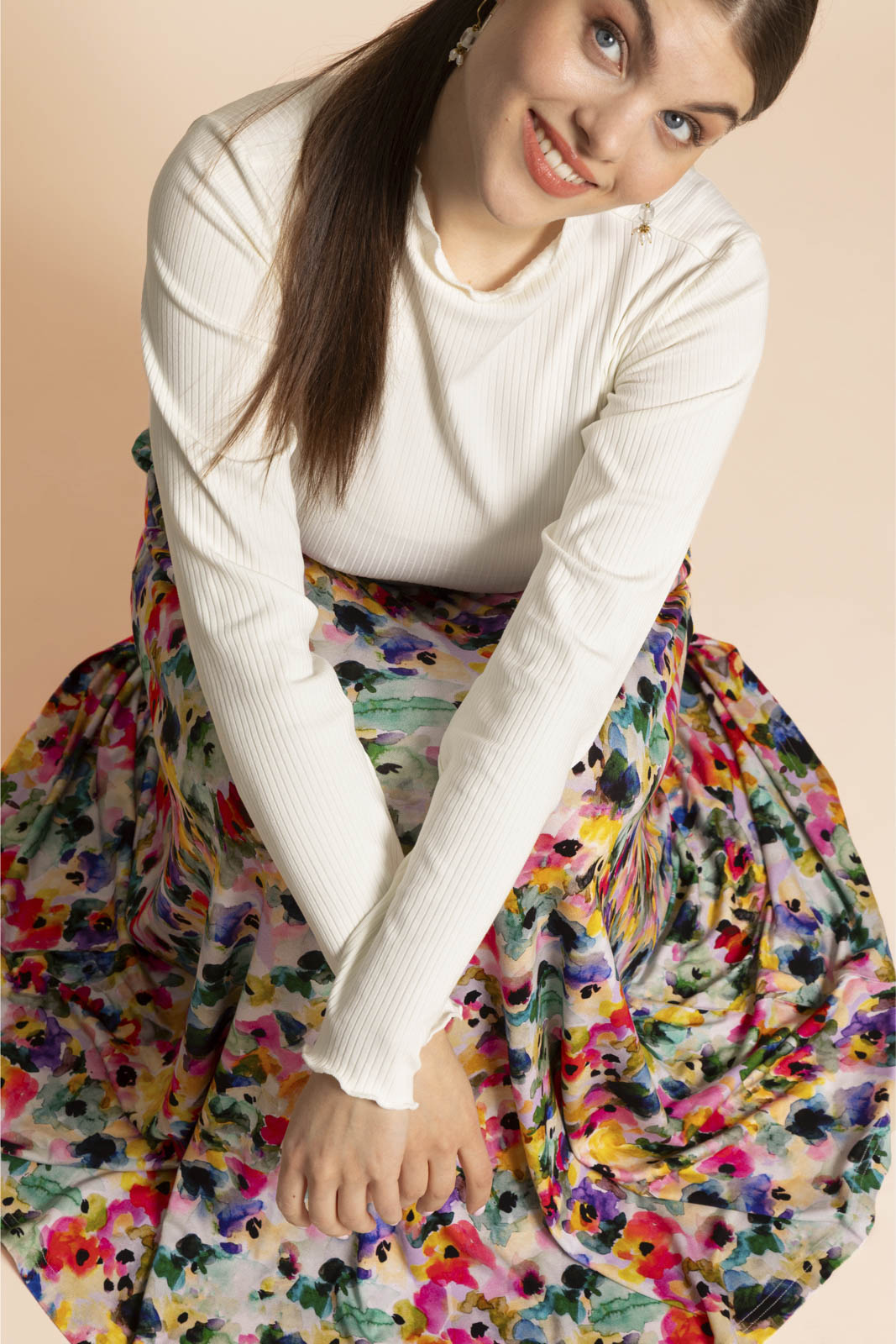 Ajaton naisten hame on helppo yhdistää omiin lempiyläosiin, ja se muuntautuu yläosaa vaihtamalla toimistolta juhlaan. Kuosina kerroksellinen ja värikäs vesiväriteos, Aquarelle Bloom.