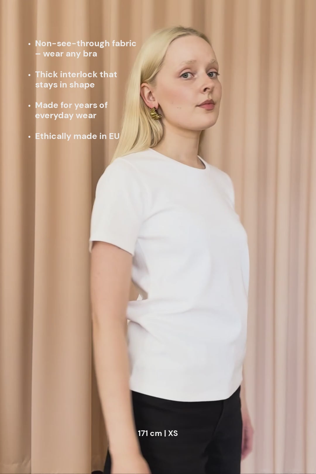 "Hieman paksumpaa materiaalia, joka säilyttää hyvin muotonsa pesussa. Laadukas T-paita, jokaisen vaatekaapin kulmakivi. Itselläni sama T-paita myös mustana, jonka tilasin jo aiemmin suositusten perusteella. Paitaa ei ole turhaan kehuttu ja voin vilpittömästi suositella!" -Riitta