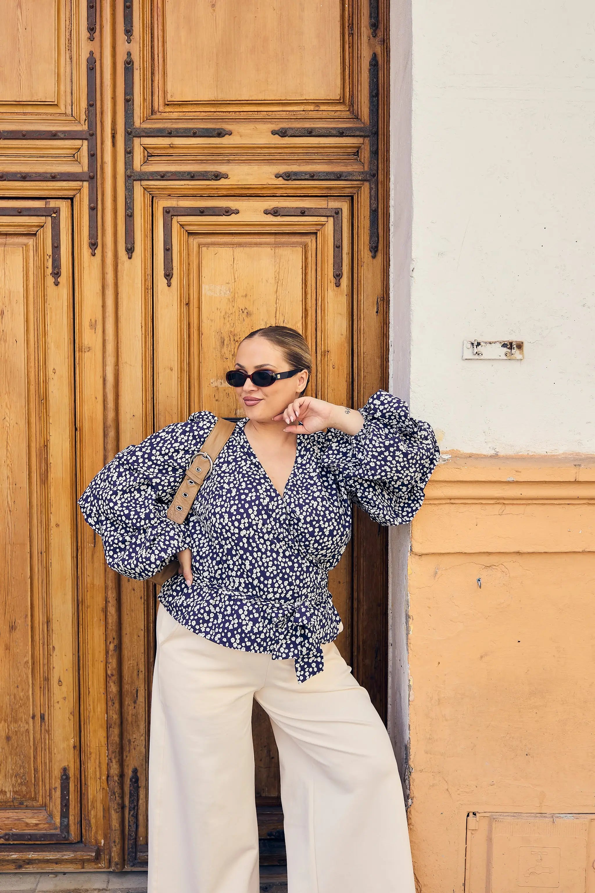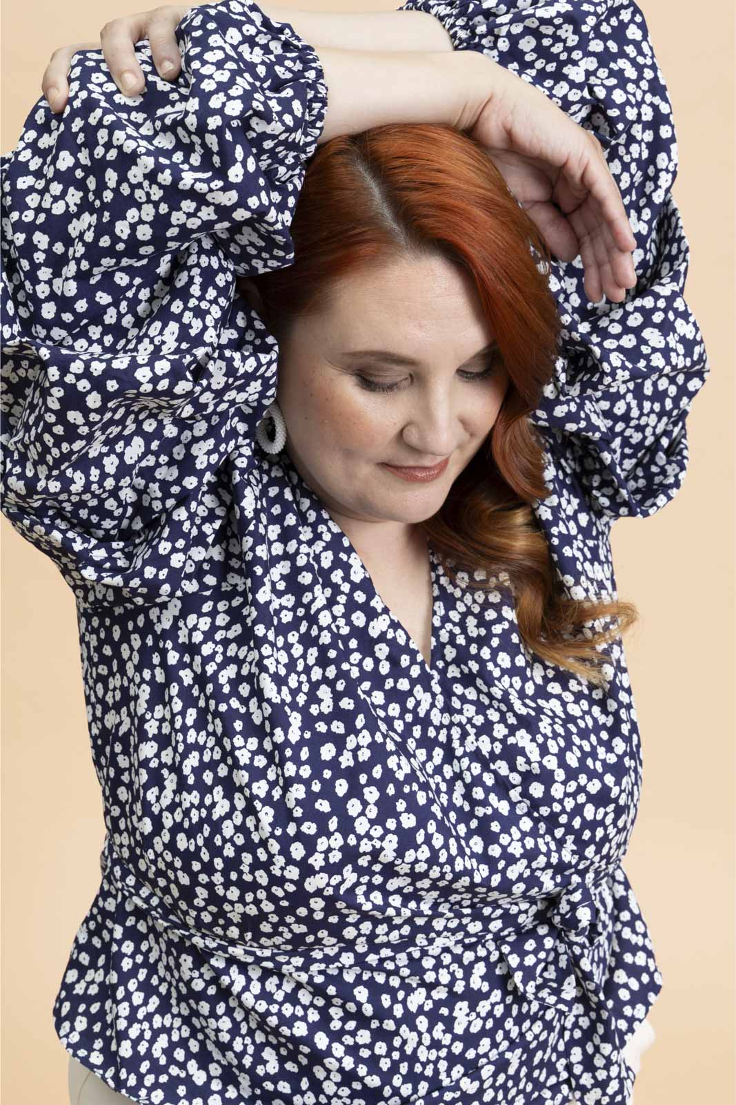 Kietaisupaidassa on solmittavat nauhat vyötäröllä sekä runsaat, kerrostetut täyspitkät hihat. Hihansuut on poimutettu kuminauhalla. Imarteleva kietaisuleikkaus ja säädettävä vyötärönauha varmistavat täydellisen istuvuuden jokaiselle vartalotyypille. Näyttävä Volume Sleeve Blouse naisten paita on täydellinen valinta juhliin ja muihin erityisiin hetkiin. Paidan kuosina tummansinipohjainen Flora Navy.