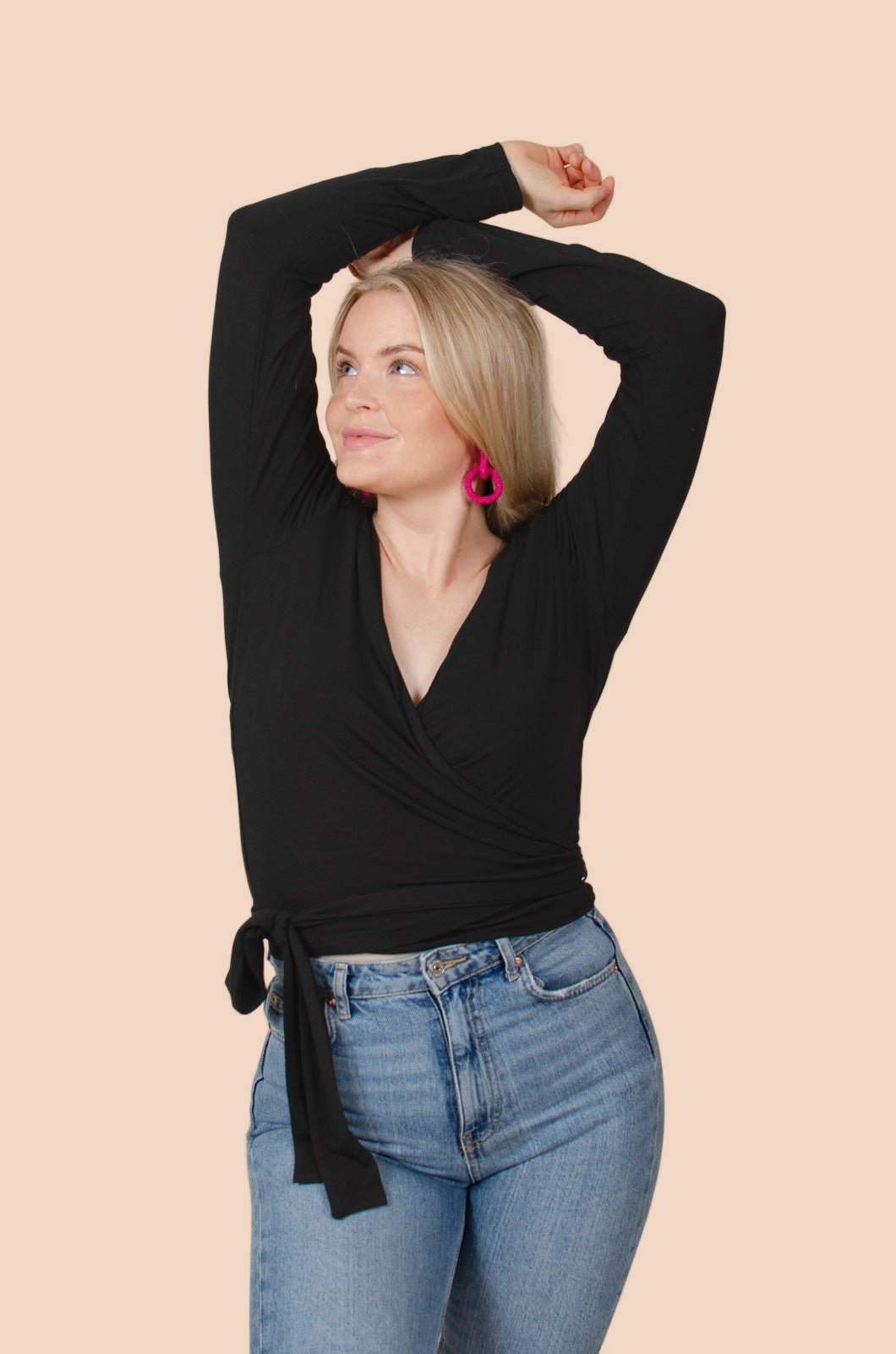 Musta Wrap Top -kietaisupaita on valmistettu ympäristöystävällisestä Naia™-sekoitteesta. Vastuullisesti sertifioidusta puumassasta valmistettu Naia™-kuitu tuo neulokseen kestävyyttä, hengittävyyttä ja silkinpehmeän tunnun. Materiaali tuntuu viileältä ihoa vasten, se hengittää hyvin ja kuivuu nopeasti.